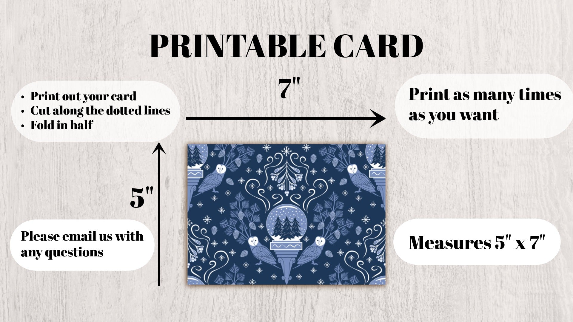 DIGITAL DOWNLOAD Midwinter Damask Greeting Card Snowglobe Barn Owl Mistletoe Pinecones 5x7 Blue Navy Printable